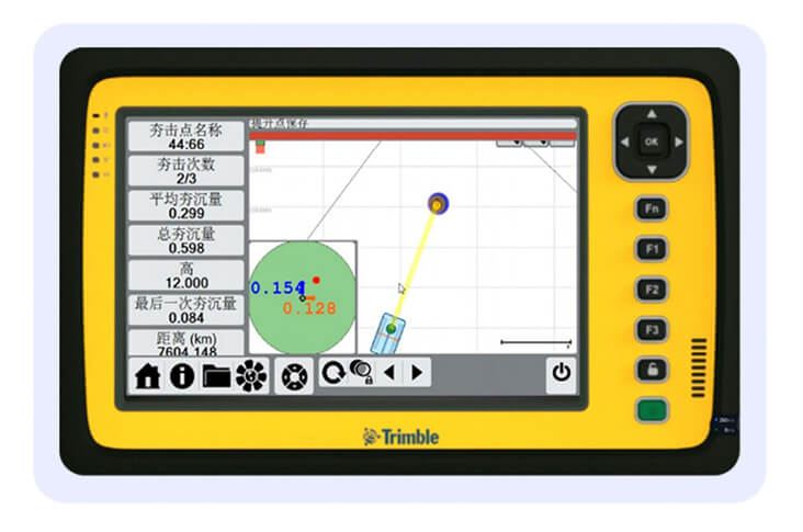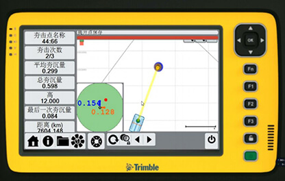 實(shí)時(shí)預(yù)警,并引導(dǎo)操作手依靠操作手內(nèi)的顯示屏進(jìn)行指導(dǎo)施工;屏幕中會(huì)顯示所有夯點(diǎn)在設(shè)計(jì)文件中的位置,操作手通過屏幕左下角的導(dǎo)航圈提示進(jìn)行夯錘的移動(dòng),利用設(shè)置好的GNSS能實(shí)現(xiàn)厘米級(jí)的夯點(diǎn)校準(zhǔn),保證施工精度,當(dāng)夯錘移動(dòng)到誤差允許范圍內(nèi)后,導(dǎo)航區(qū)會(huì)變成綠色,提示操作手可以進(jìn)行強(qiáng)夯。